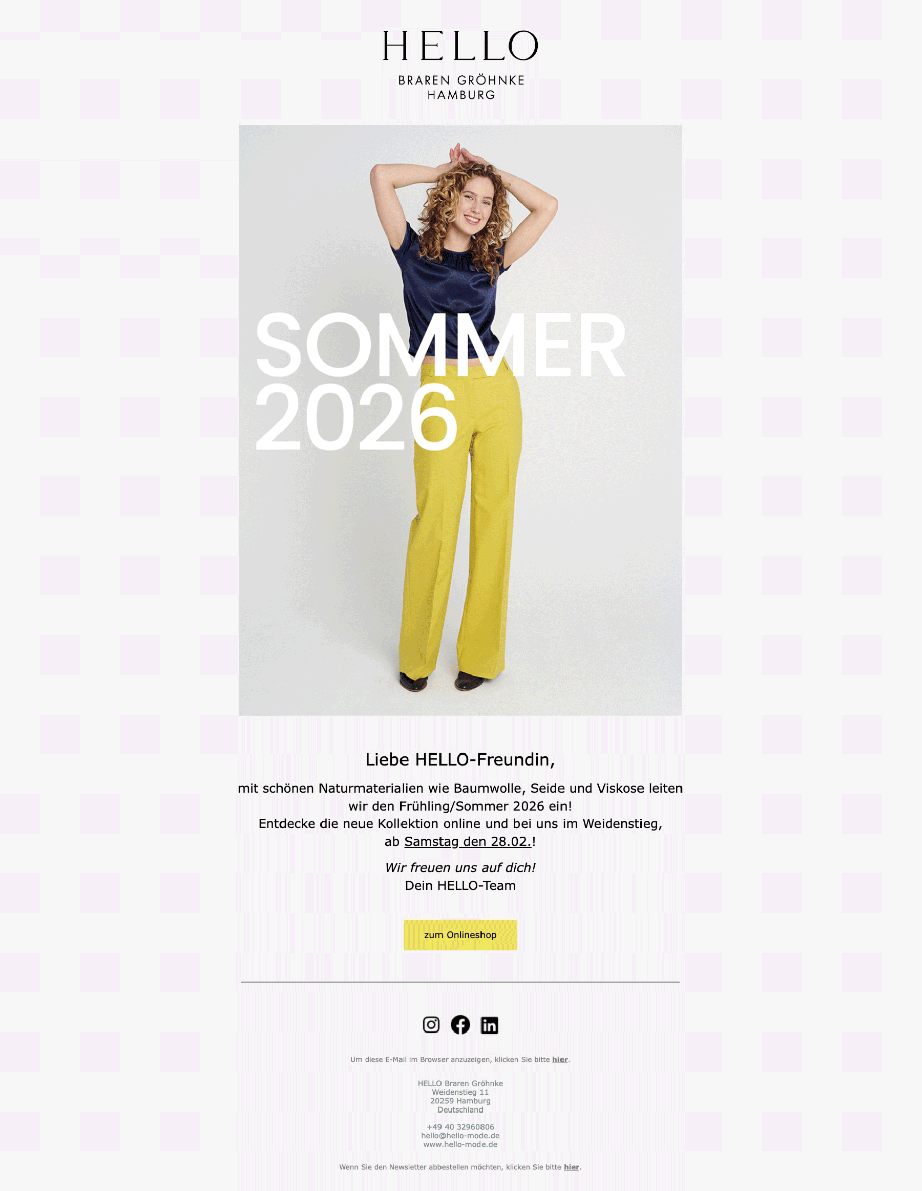 Projekt: Das Modelabel "HELLO" wurde 1996 von Telsche Braren und Susanne Gröhnke in Hamburg gegründet. Die beiden Designerinnen entwerfen jährlich zwei zeitlos elegante Kollektionen, die in ihrem Geschäft in Hamburg-Eimsbüttel oder online erhältlich sind.